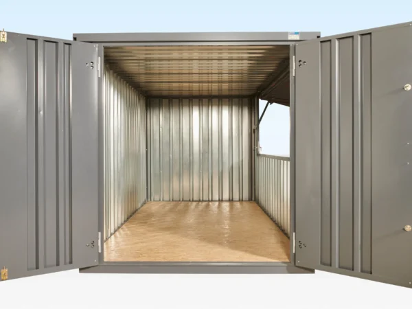 Flach verpackter Container mit seitlich zu öffnender Luke (oben angeschlagen) an der 4 m langen Seite. Diese Luke kann je nach Bedarf an beiden Längsseiten positioniert werden.