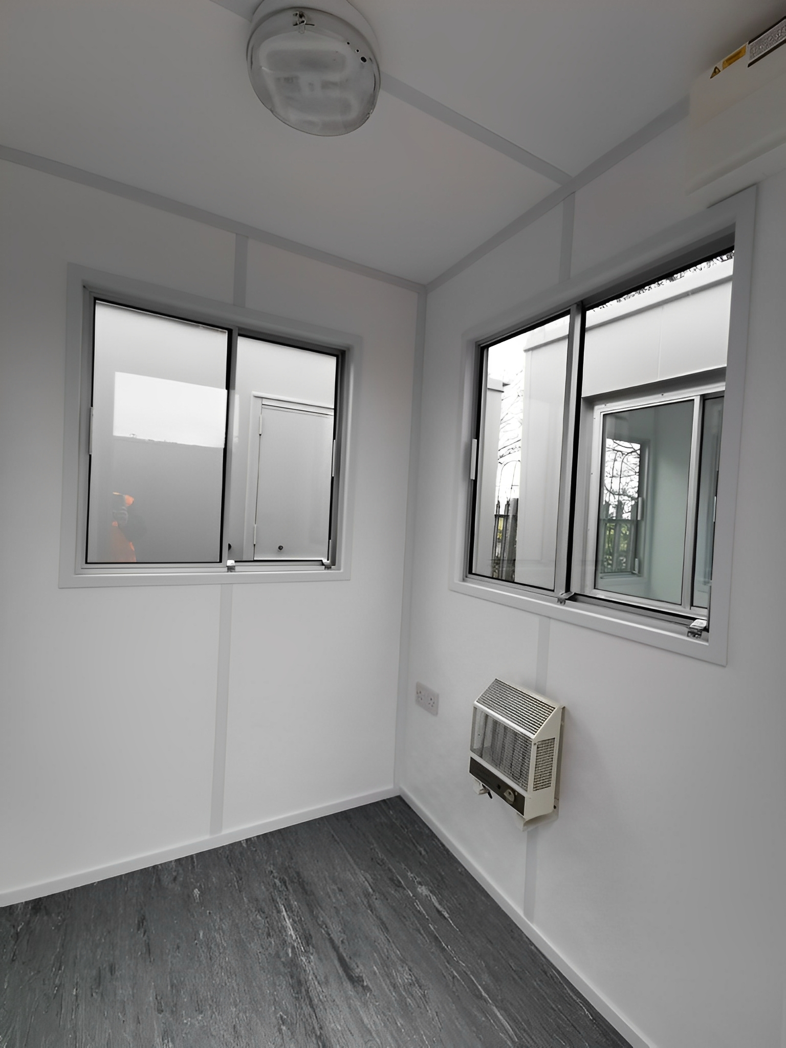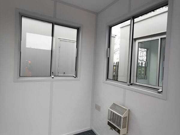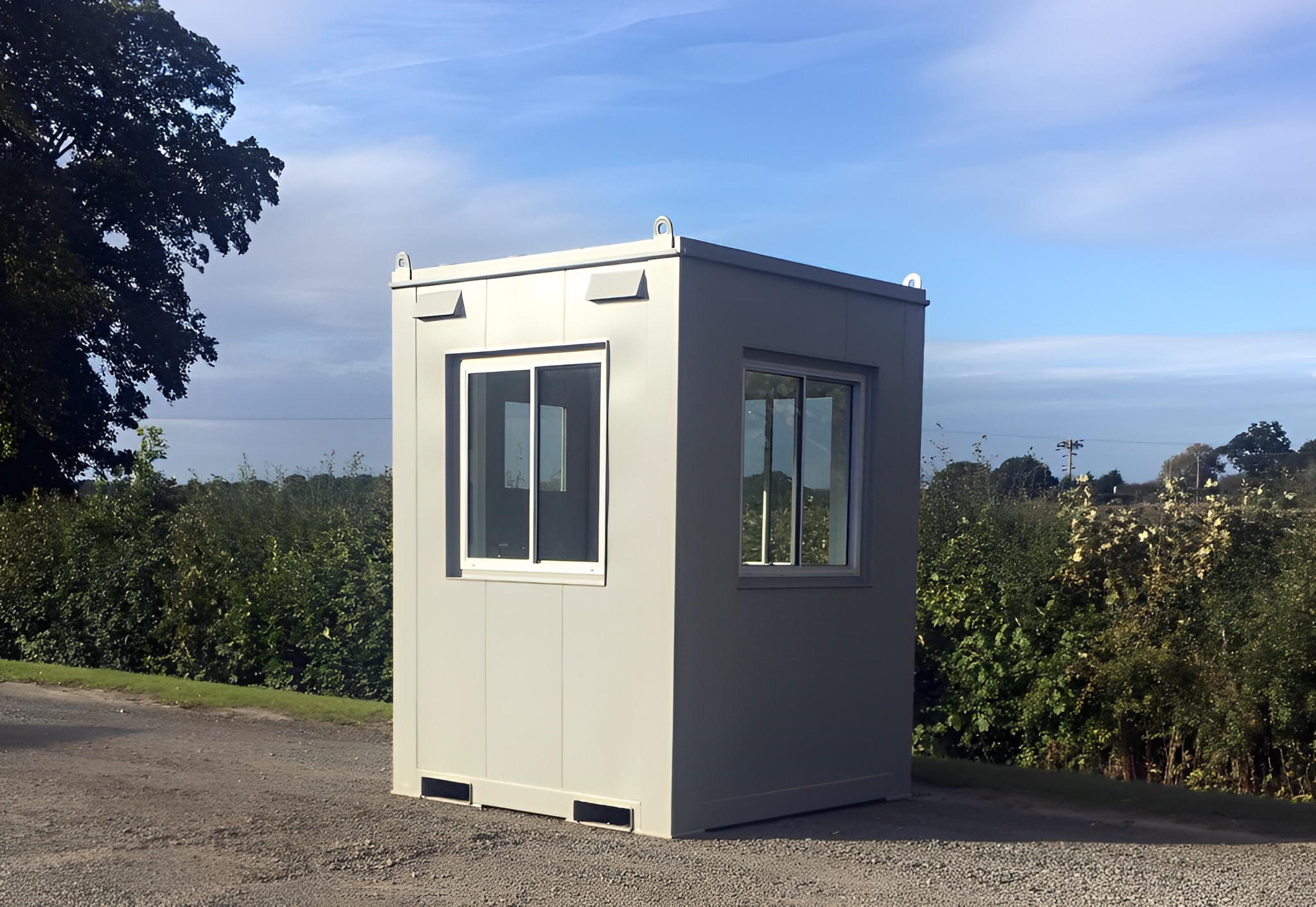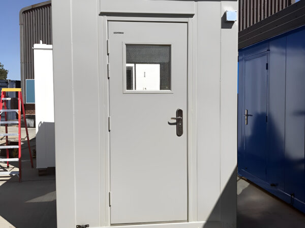 Die 1,83 m x 1,83 m große Einzelwachkabine ist eine kompakte, komplett aus Stahl gefertigte Sicherheitskabine, die maximale Sicht, Wetterschutz und Langlebigkeit für einen Sicherheitsmitarbeiter bietet. Dank Fenstern an drei Seiten und einer Tür bietet diese Einheit eine 360°-Rundumsicht und eignet sich daher ideal zur Zugangskontrolle und Überwachung des Umfelds an stark frequentierten oder sensiblen Orten.