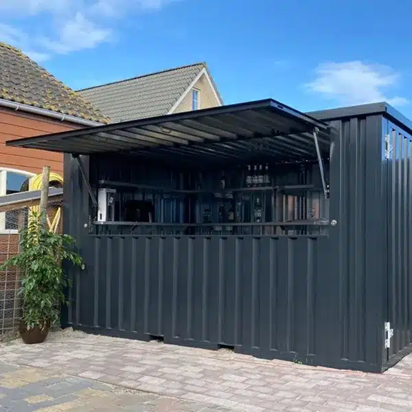 Ein besonderes Merkmal ist das faltbare Vordach an einer Längsseite, das den Container in einen lebendigen, offenen Raum verwandelt Mit Abmessungen, die einem klassischen 10-Fuß-Container entsprechen, überzeugt der demontierbare Barcontainer durch Flexibilität, Stabilität und ansprechende Optik. Das klappbare Vordach schafft eine einladende Atmosphäre und erleichtert die Interaktion mit Gästen, wodurch Ihr Standort sofort ins Auge fällt.